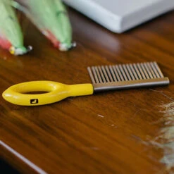 The solution to unruly materials at the vise or mangled streamers on the water. The ergonomic powder coated tool is easy find and comfortable in hand, and the stainless steel shaft and teeth make quick work of messy flies at the bench or on the water