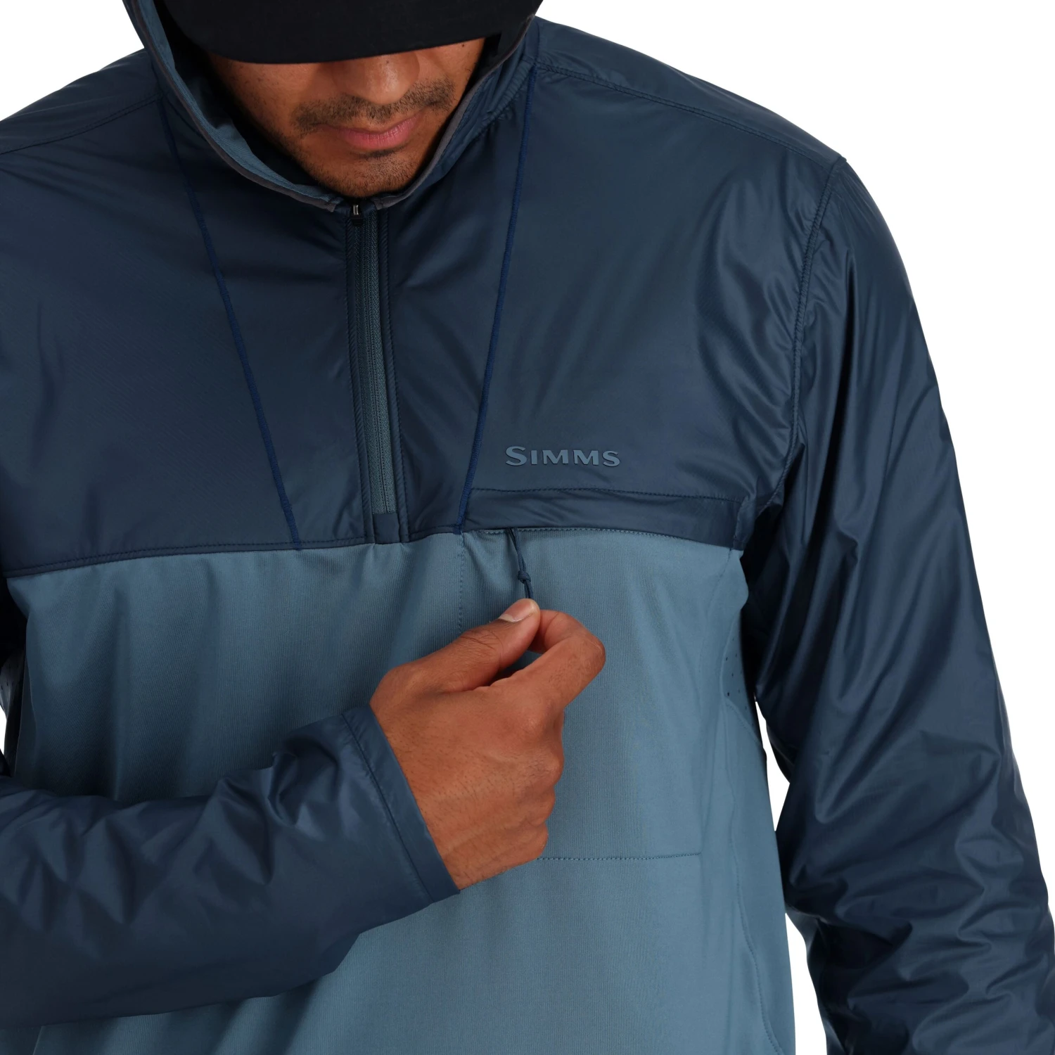 - 3-panel hood designed for sun protection overlaid with wind block ripstop material. Quarter length center front zipper and horizontal zippered left chest pocket for essentials.